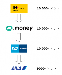 - メトロポイントに移行した10,000ポイントをANAマイル9,000マイルに交換(90%)